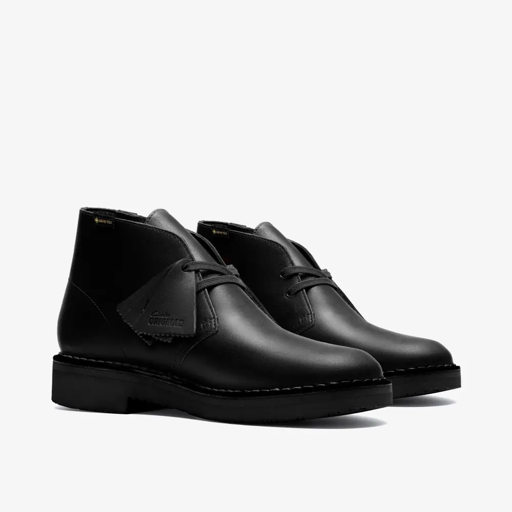 Cultural cachet and design DNA: no shoe is quite like the Clarks Originals Desert Boot. Born in the '50s, its minimal, progressive style sparked a worldwide footwear revolution . And every design detail today remains true to that first pioneering pair. Here, the boot’s crafted, clean lines are enhanced with premium black leather with a waterproof GORE-TEX® membrane and finished with an unfussy lace fastening.
