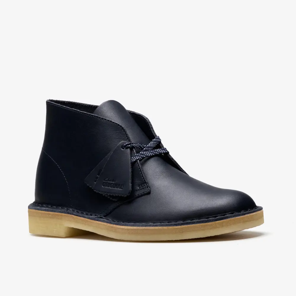 Cultural cachet and design DNA: no shoe is quite like the Clarks Originals Desert Boot. Born in the '50s, its minimal, progressive style sparked a worldwide footwear revolution. And every design detail today remains true to that first pioneering pair. Here, the boot’s crafted, clean lines are enhanced with premium navy leather and finished with an unfussy lace fastening. The authentic crepe sole completes this distinctive silhouette. Instantly recognizable, forever iconic. A true original.