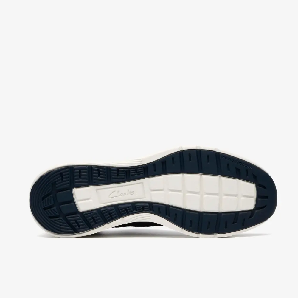 - Breathable navy engineered knit upper