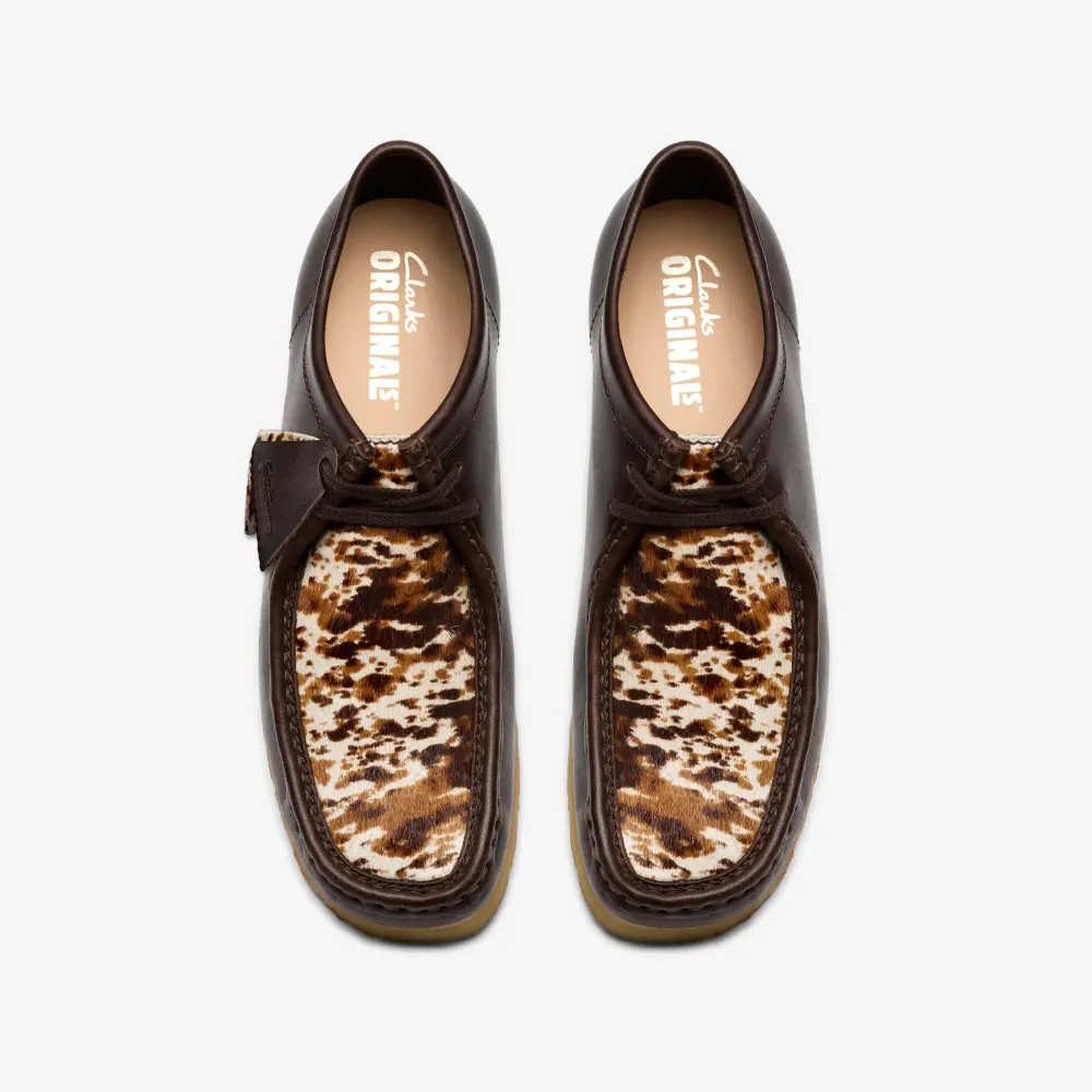 The Brown Interest version combines leather side quarters with a hair-on speckled vamp, creating a visually striking effect. Complete with a flat tonal lace and natural pebble crepe sole.