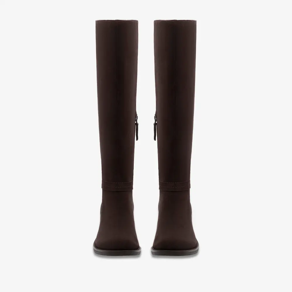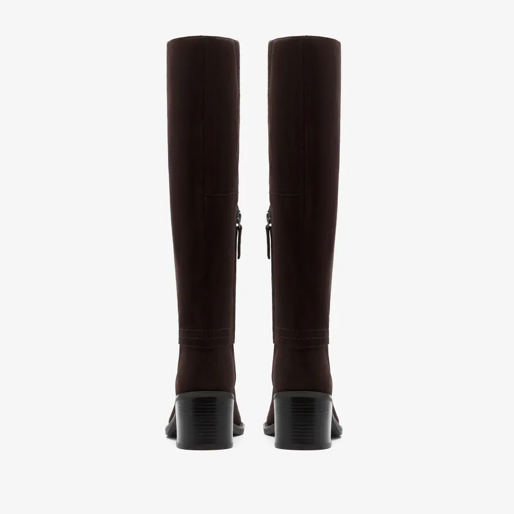 Elevate weekday or evening dressing with classic knee high boot Chamberly Hi. A luxe dark brown suede upper and stacked heel deliver a premium, timeless finish, completed with a pillowy foam footbed for signature round-the-clock Clarks comfort.