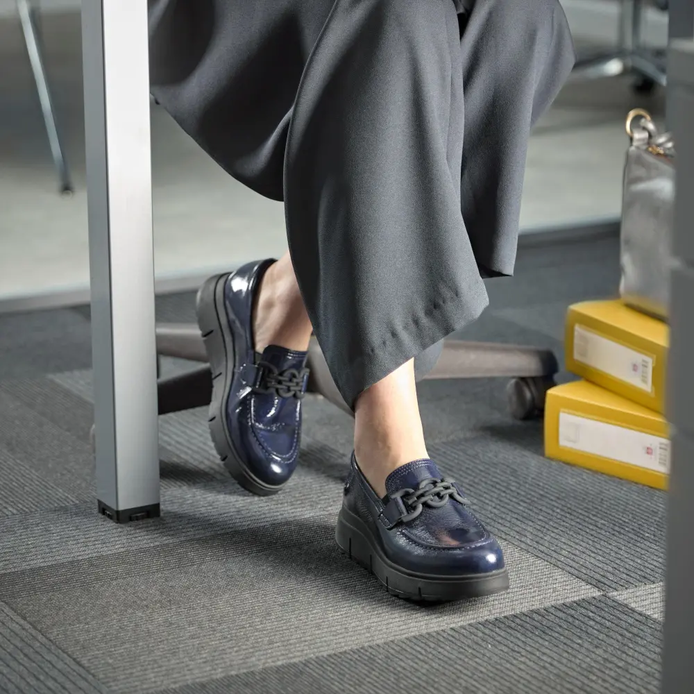 Bold shoes mean business, and our Loriini Izzy leather slip on is perfect for work and after-hours alike. Set atop a chunky wedge heel with flex grooved soles for ultimate stability, it makes use of our signature Contour Cushion footbeds to move you forward in total comfort. An almond toe shape and sleek metal trim bring a contemporary finish to this staple.