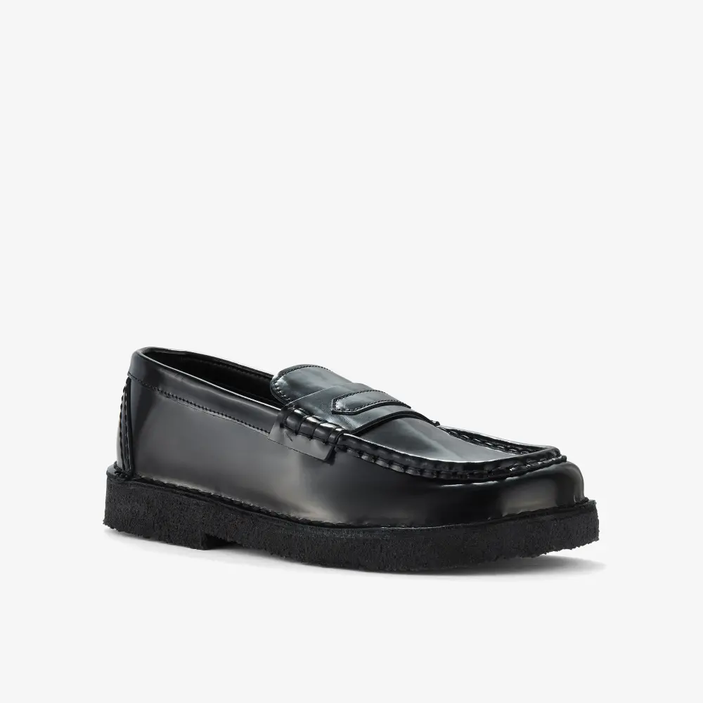 Available in black patent leather upper atop a black pebble crepe sole.