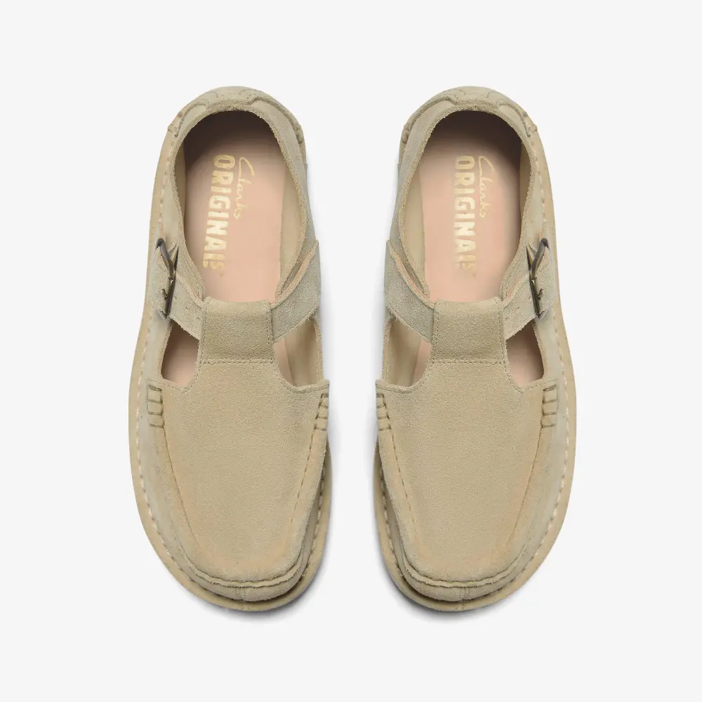 Crafted with suede uppers and a secure buckle fastening, the Nomad T Bar combines functionality with refined details. The hand-stitched apron seam adds a touch of craftsmanship, while the Clarks Originals heat-embossed metallic logo on the sock and the iconic camel Trek Man embossed on the heel counter showcase the shoe’s heritage.